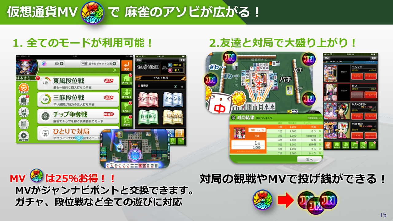 MVをジャンナビにインポートすることでジャンナビポイントを他決済手段よりも多く獲得でき、お得にジャンナビをプレイすることが可能となります。ジャンナビポイントを活用して新ゲームモード「e-Sports対局」に参加、観戦時の「投げ銭」、「ガチャを引く」など、様々なコンテンツに使用することが可能です。