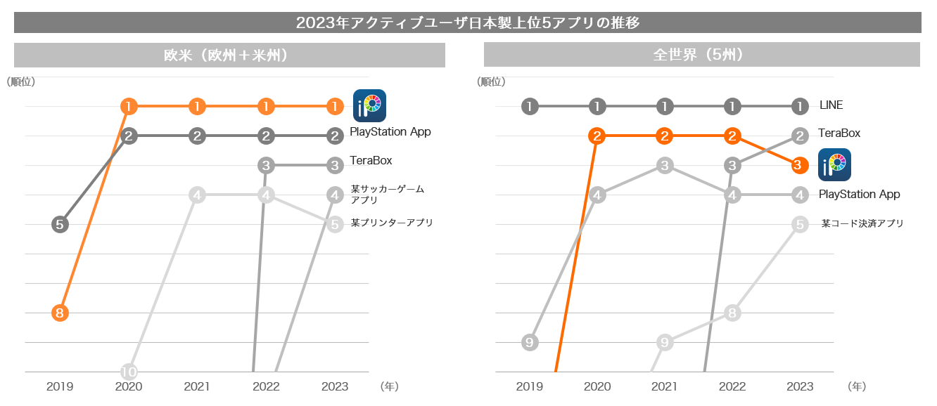 ■5つの日本製アプリが全世界及び各地域のアクティブユーザ数で上位を占める(2023年)