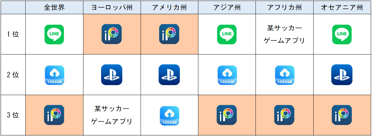 調査期間のうち、2023年の全世界及び各地域のアクティブユーザランキングに目を向けると、全世界のランキング1位はコミュニケーションアプリ「LINE」で、日本との親和性が特に高いアジア州、オセアニア州を中心に普及していることがわかりました。また、PlayStation公式コンパニオンアプリ「PlayStation App」はゲーム文化が盛んとされるヨーロッパ州、アメリカ州、オセアニア州の3地域、某サッカーゲームアプリはヨーロッパ州、アフリカ州といったサッカー人気が高いと考えられる2地域を中心にユーザを獲得しており、地域性とアプリの高い相関性が伺えます。