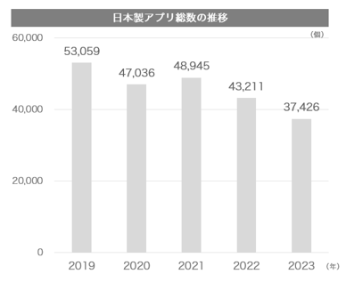 日本製アプリの総数は近年明らかな減少傾向にあり、2019年には5万を超えていたその数も、2023年は約3.7万まで減少していることが判明しました。一方で、日本のユーザあたりの1日のモバイル利用時間は近年増加傾向にあり、2020年は3時間強でしたが、2023年は4時間弱(※2)となり過去最高を記録しました。この状況は、日本のアプリ市場内での寡占が進んでいることを物語っており、シビアな生存競争や継続して利用される難しさが表れております。