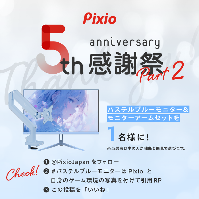 Pixio公式X(旧Twitter)アカウント(@PixioJapan)にて、豪華賞品が当たる5周年記念RPキャンペーンを開催します。