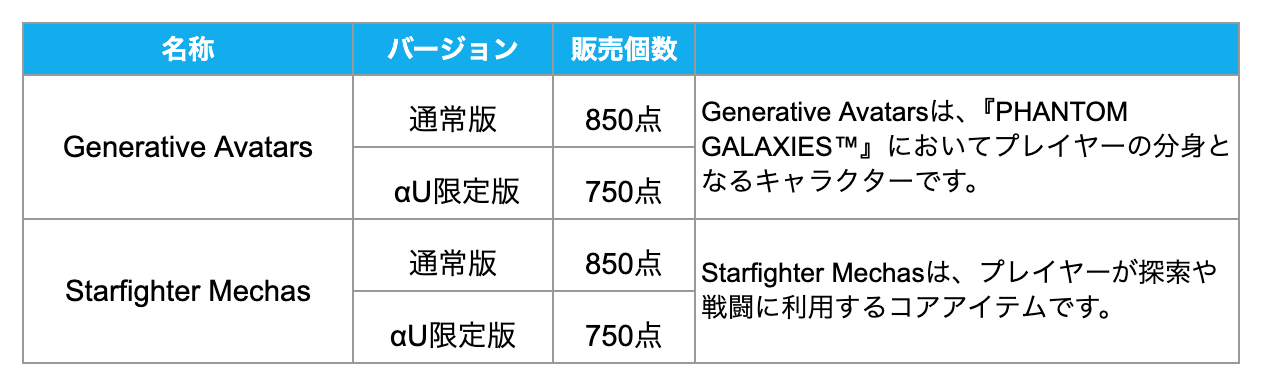 Animoca Brands Japanは、2024年3月にKDDIとWeb3分野での事業連携に関する基本合意書を締結し、よりWallet事業でのグローバルな協業でWeb3による新たな顧客体験を提供や『PHANTOM GALAXIES™』をはじめとするAnimoca Brands傘下のIP・コンテンツ連携を検討してきました。事業連携の第1弾となる今回は、「αU market」において『PHANTOM GALAXIES™』のゲーム内で使用できる「Generative Avatars」と「Starfighter Mechas」の標準版と「αUオリジン」による独自の外見的特徴を持ったαU限定版を販売します。