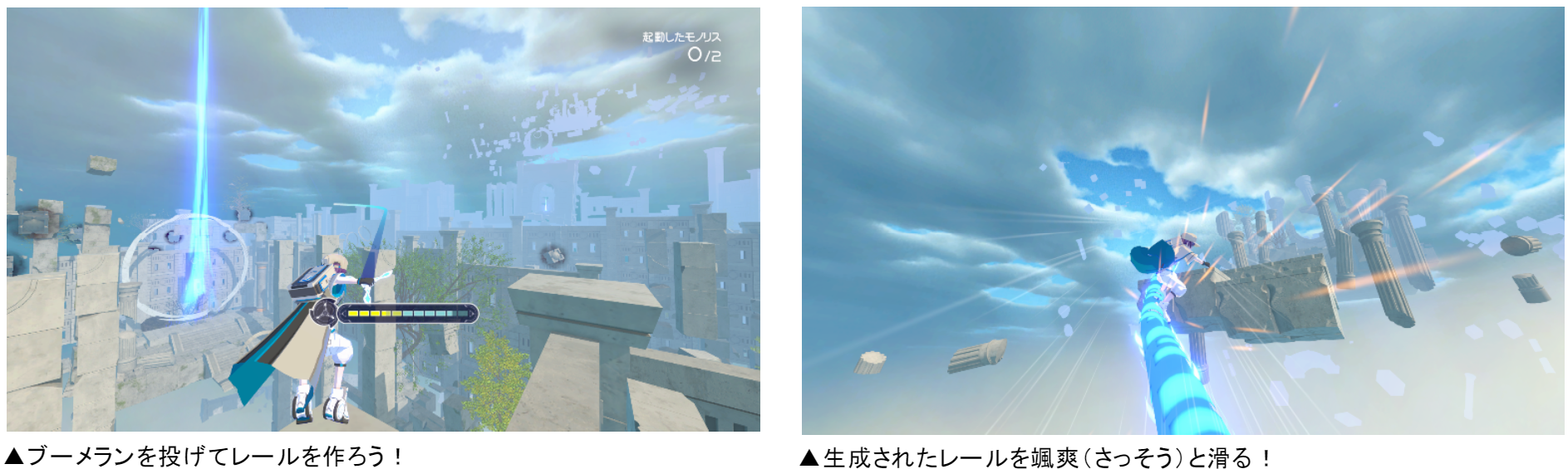 ▼ 投げたブーメランの軌跡がレールとなる!