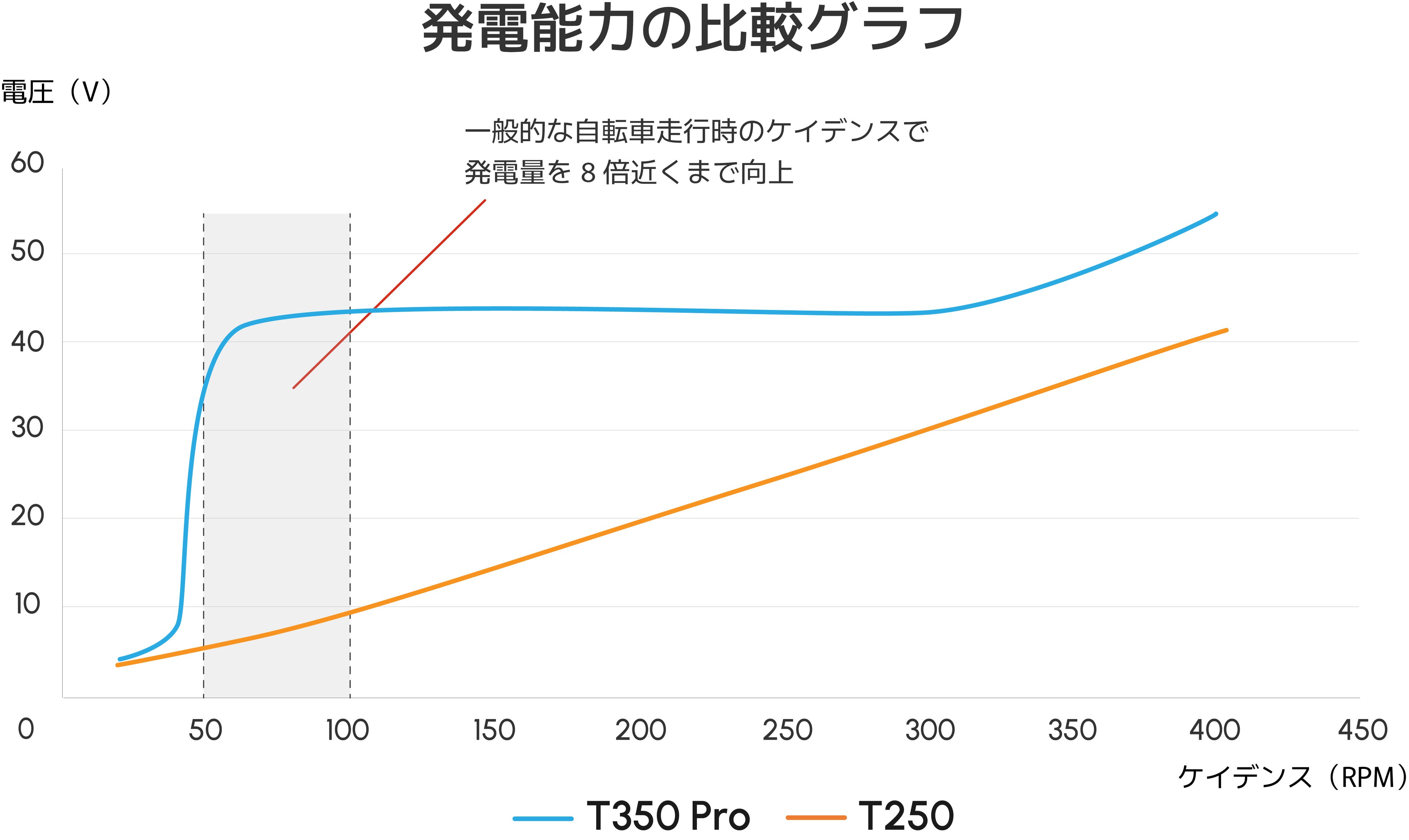 ENNE T350 Proはリアキャリアに本機専用のコンバーターキットを搭載することにより、50RPMから100RPMのケイデンスで発電機を回すことで、発電機はバッテリーと同程度の電圧を生成することが可能となりました。50RPMから100RPMのケイデンスはゆっくり自転車をこぐくらいのスピードです。ペダルの重さは必要な電力により変化しますが、ギヤなしの自転車を平坦な場所で漕ぐくらいの負荷となります。