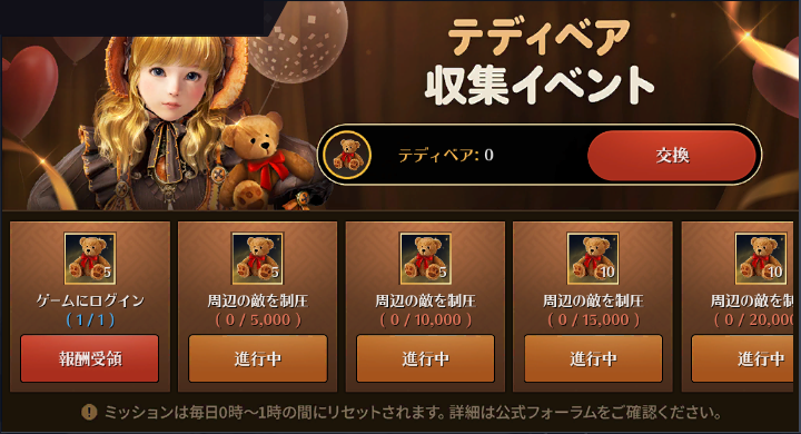 イベント期間中、ミッションをクリアすると、イベントページより報酬を獲得することができます。獲得した「テディベア」は、当イベントページの「交換」ボタンからお好きなアイテムと交換することができます。ミッション条件などの詳細は、以下URLをご参照ください。