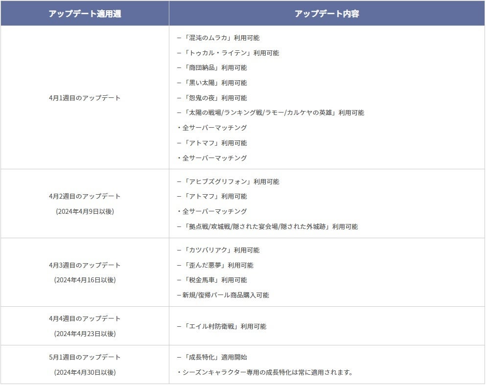 シーズンキャラクター:スプリングシーズンが開始しました。シーズンキャラクターは4月2日(火)メンテナンス後~7月4週目のメンテナンス(7月23日(火)実施予定)前まで作成することができ、家門当たり1キャラクターのみ作成できます。既に全てのキャラクタースロットを使用中の場合は、任意のキャラクターを削除してキャラクタースロットを空けると、シーズンキャラクターを作成することができます。また、シーズンキャラクターはシーズン依頼を完了する度に成長に必要な報酬を獲得できます。