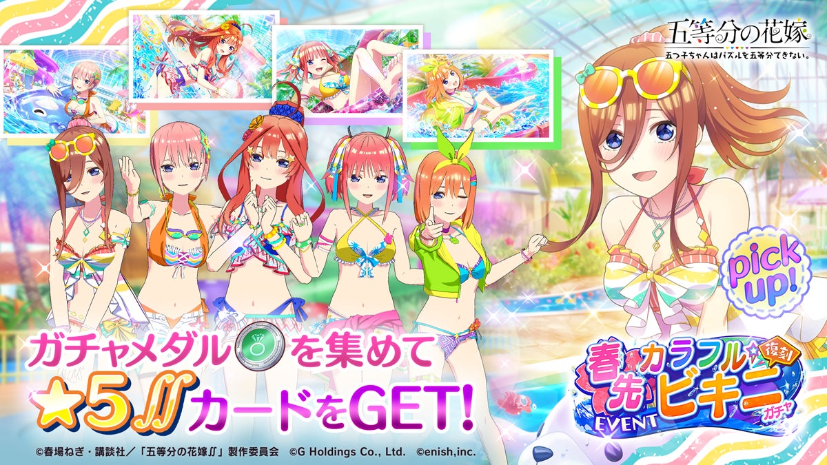 イベント「五つ子ちゃんの水上バトルは、今だけ二乃のために~背中を預けたい人は…~」に先駆けて、「春先カラフルビキニ」をテーマにしたガチャが期間限定で開催中です。