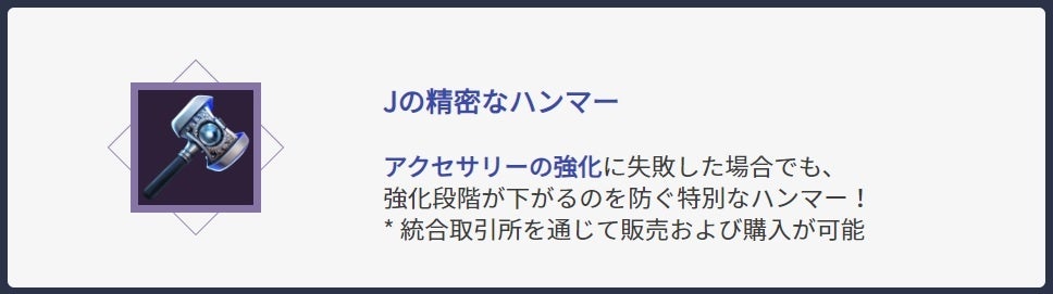アクセサリーの強化時に一緒に使うと、強化に失敗しても強化段階が下落しない「Jの精密なハンマー」がゲーム内に登場しました。こちらは以下の条件をすべて達成したキャラクターで、イベント期間中にログインすると、挑戦課題を通じて家門あたり1回獲得可能です。