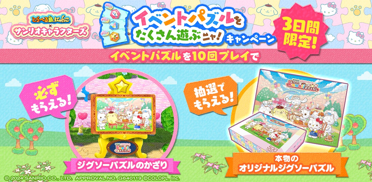本日4月5日(金)15:00より、期間限定キャンペーン「イベントパズルをたくさん遊ぶニャ!キャンペーン」を実施しています。期間中にイベントパズルを10回遊んでくれた方全員に、今回のコラボイベントのキービジュアルをデザインに使用した、島における特別なかざり「kawaiiジグソーパズル」をプレゼントします。