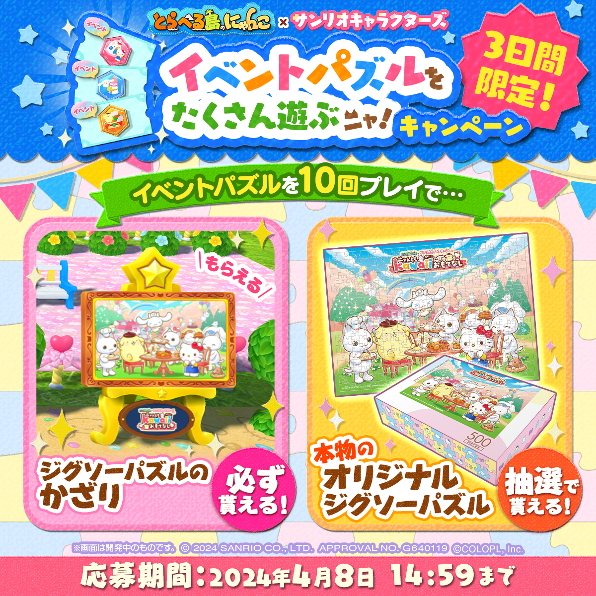 本日4月5日(金)15:00より、期間限定キャンペーン「イベントパズルをたくさん遊ぶニャ!キャンペーン」を実施しています。期間中にイベントパズルを10回遊んでくれた方全員に、今回のコラボイベントのキービジュアルをデザインに使用した、島における特別なかざり「kawaiiジグソーパズル」をプレゼントします。
