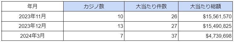 ※2024年3月時点での海外カジノの大当たり件数と総額