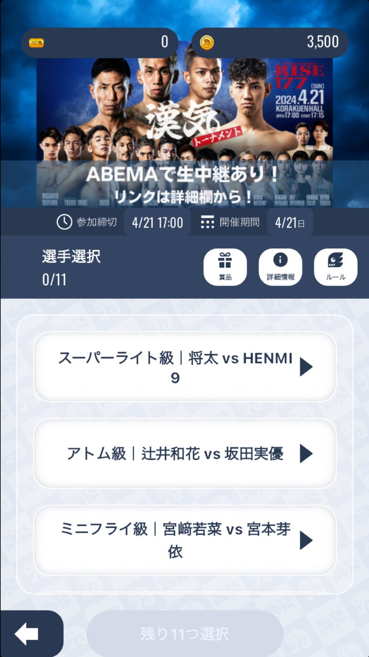 大会のピンチに名乗りをあげた勇気ある選手たちの意思を尊重したこのトーナメント。その名も『漢気トーナメント』。RISE177のメインイベントである、『漢気トーナメント』決勝戦をはじめ全11試合を対象に勝敗予想を開催します。
