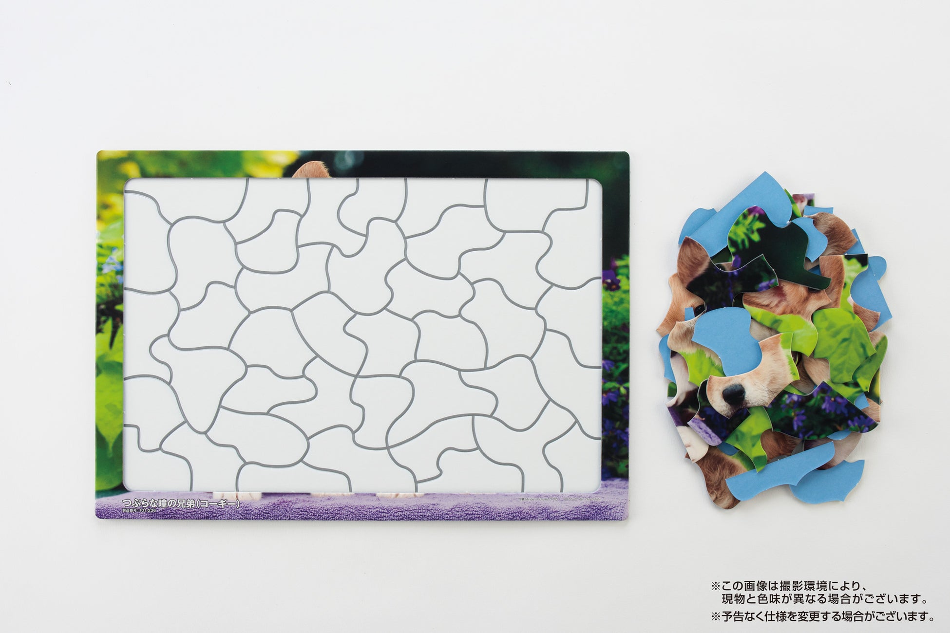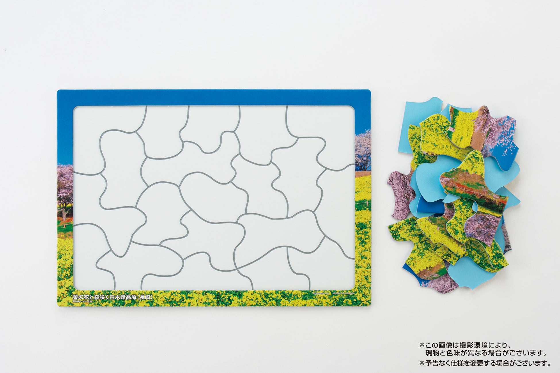 台紙付きのジグソーパズルで、台紙にはピース形状が印刷されており、絵柄以外にもそのピース形状をヒントに組むことが出来ます。