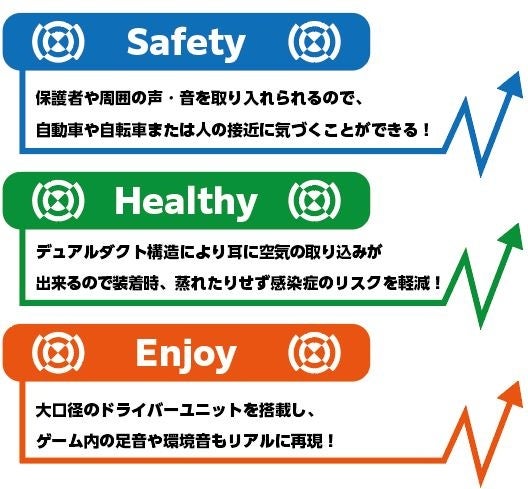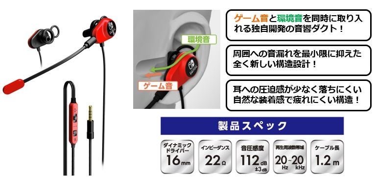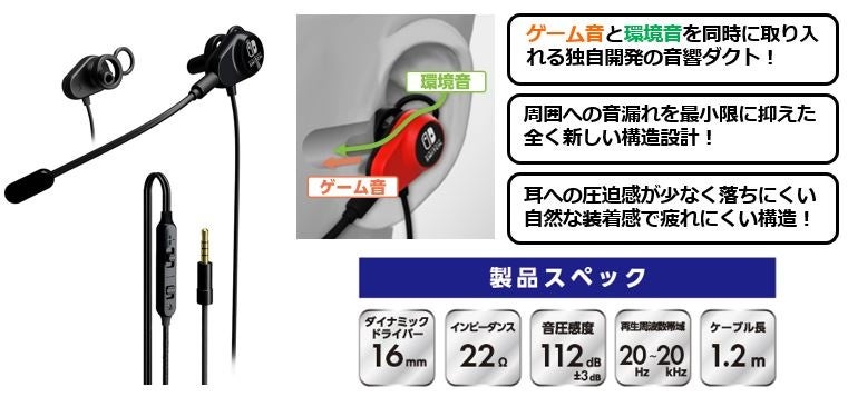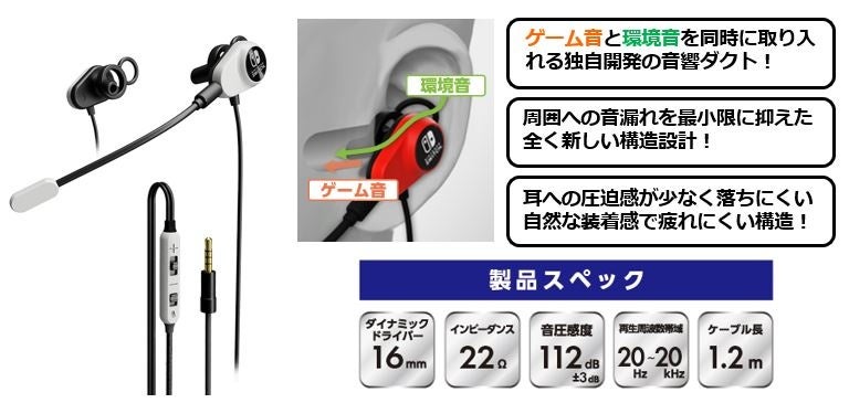 特許技術『デュアルダクト構造』によりゲーム音と環境音を同時に聞き取ることができるオープン型でもカナル型でもない全く新しいイヤホンです。