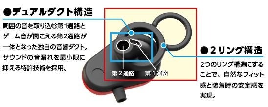 特許技術『デュアルダクト構造』によりゲーム音と環境音を同時に聞き取ることができるオープン型でもカナル型でもない全く新しいイヤホンです。