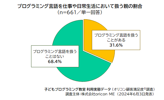 つづいて、プログラミング教室に通っている(いた)子どもの家庭環境を把握する目的の設問として、両親のどちらかが「プログラミング言語を仕事や日常生活で扱うか」について聴取したところ、「プログラミング言語を扱うことがある」と回答した割合は31.6%となりました。