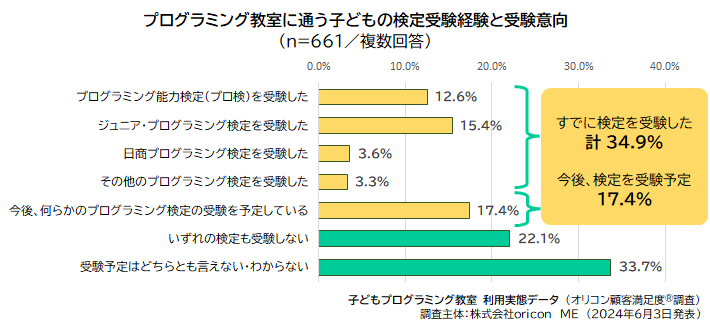 プログラミング教室で学ぶ子は「男の子」が75.9% 子どもがよく遊ぶゲームは“マイクラ”が最多 51.9% 各種プログラミング能力検定「受験した」計34.9% 「受験予定」 を含めて過半数が受験視野に