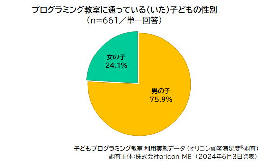 つづいて、「子どもプログラミング教室に通っている(いた)子どもの性別」について聴取したところ、「男の子」が75.9%、「女の子」が24.1%と、男の子の割合が多い状況となっています。