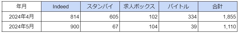 主要4サイト別の数値としては、「Indeed」が900件、「スタンバイ」が67件、「求人ボックス」が104件、「バイトル」が39件となりました。