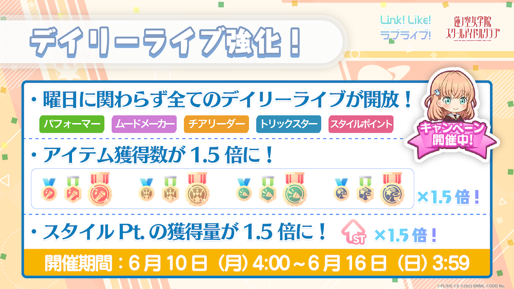 期間中、曜日に関わらず全てのデイリーライブを開放!アイテムの獲得数が1.5倍及びスタイルPt.の獲得量が1.5倍になります。