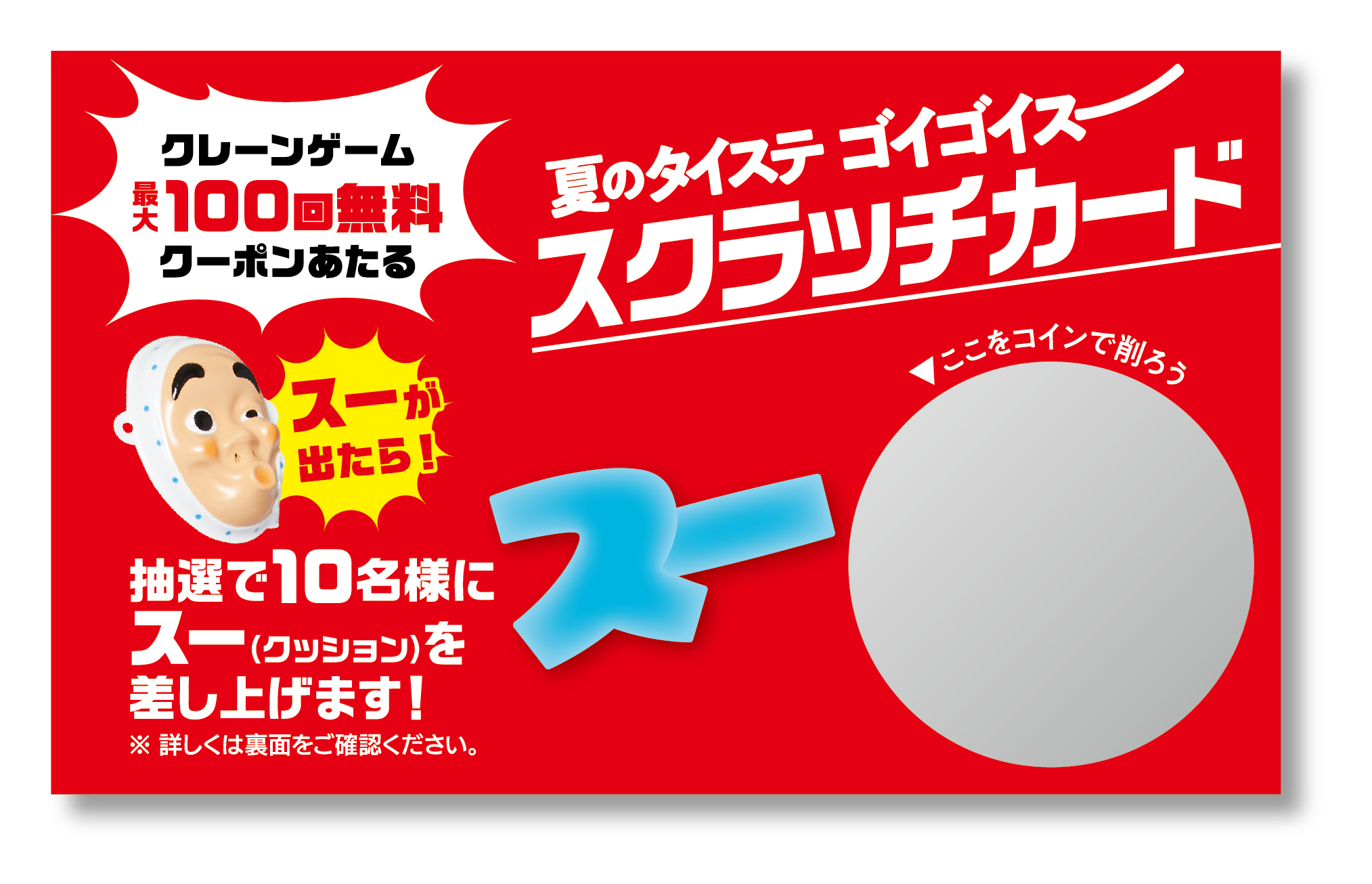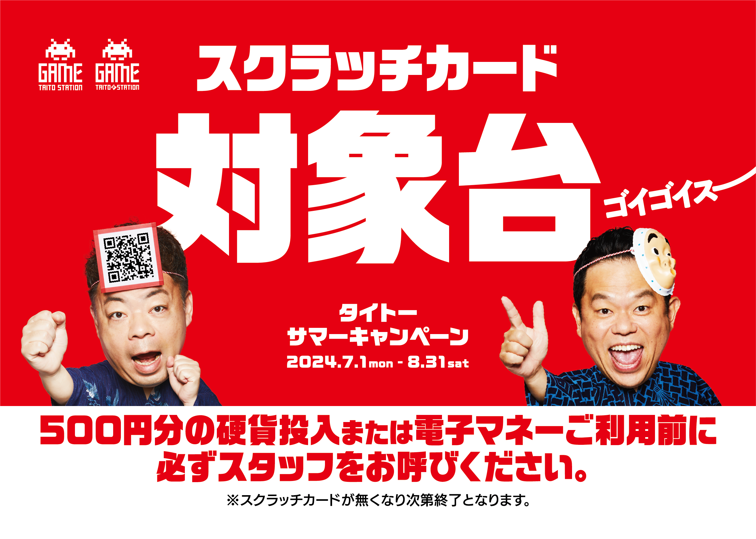 対象店舗の対象台POPのついたゲーム機に、500円分の硬貨投入または電子マネーご使用で、もれなく「スクラッチカード」1枚を差し上げます。