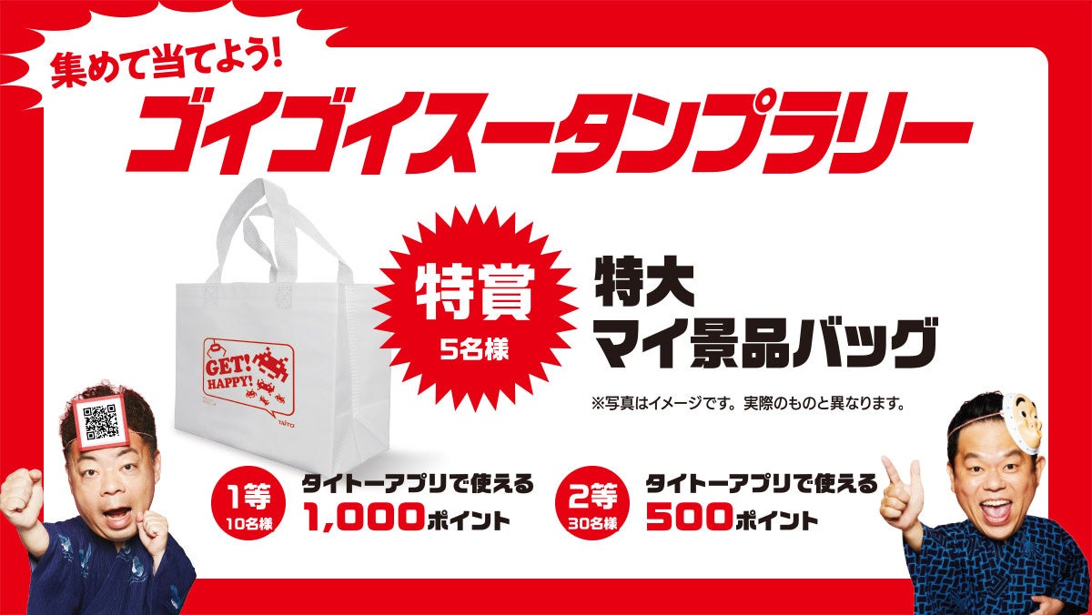 キャンペーン対象店舗にてスタンプラリーポスターにタイトーアプリをかざすとスタンプをゲットできます。スタンプを3個集めると、特大マイ景品バッグやポイントがあたる抽選にご応募いただけます。