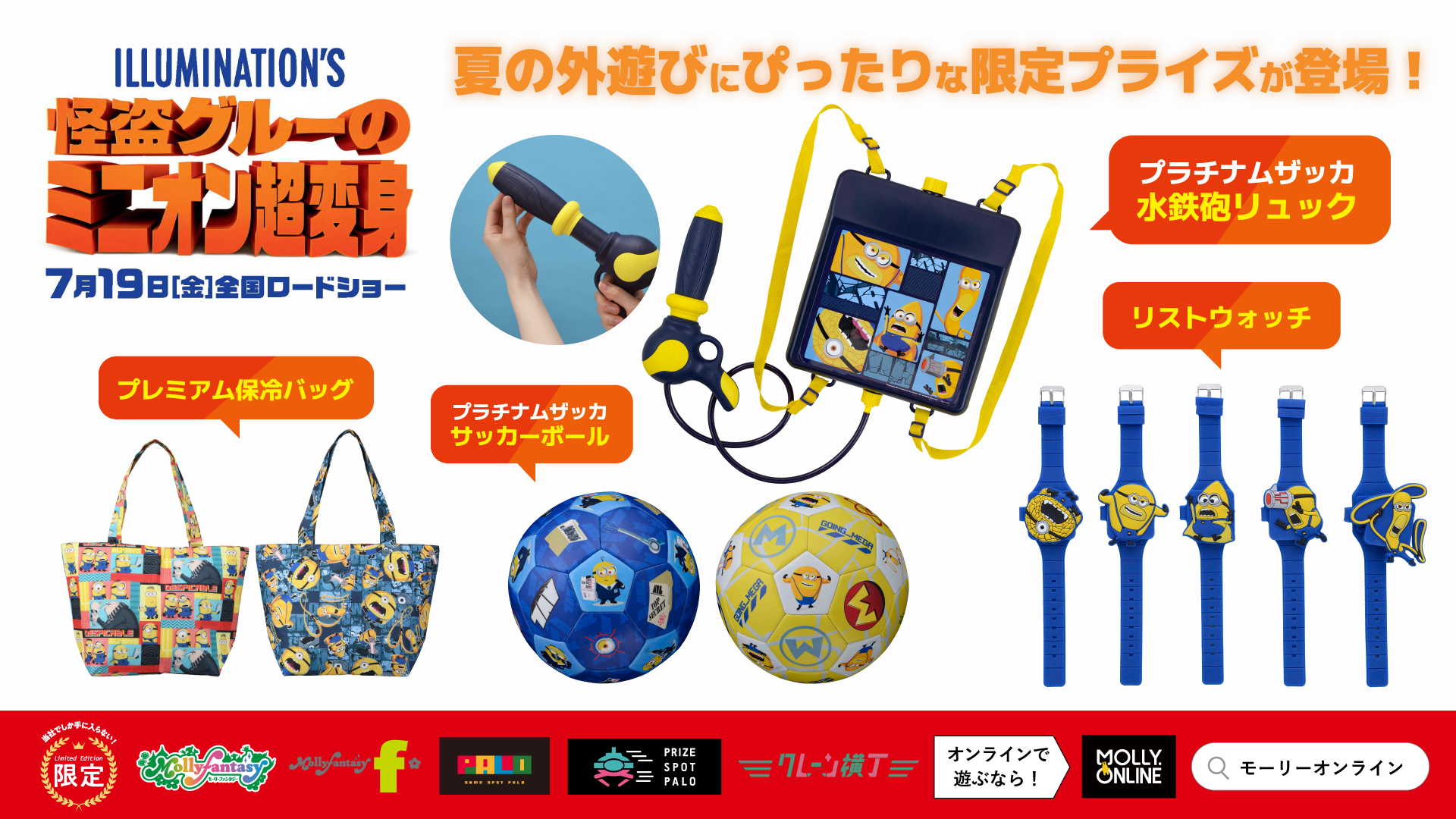 2024年7月19日(金)に公開される映画『怪盗グルーのミニオン超変身』のプライズが映画公開日にモーリーファンタジー・PALO限定で登場。メガミニオンたちがデザインされたスクエア型リュックの「プラチナムザッカ水鉄砲リュック」、スーツやオーバーオール姿のミニオンがデザインされた「プラチナムザッカサッカーボール」、怪盗グルー、グルーJr.やミニオンたちのイラストが描かれた大容量の「プレミアム保冷バッグ」に、メガジェリー、メガデイブ、メガガス、メガメル、メガティムのラバー素材のマスコットが付いた「リストウォッチ」の4アイテム全10種類を展開いたします。夏の“外遊び”をいっぱい楽しめるアイテムとなっています。