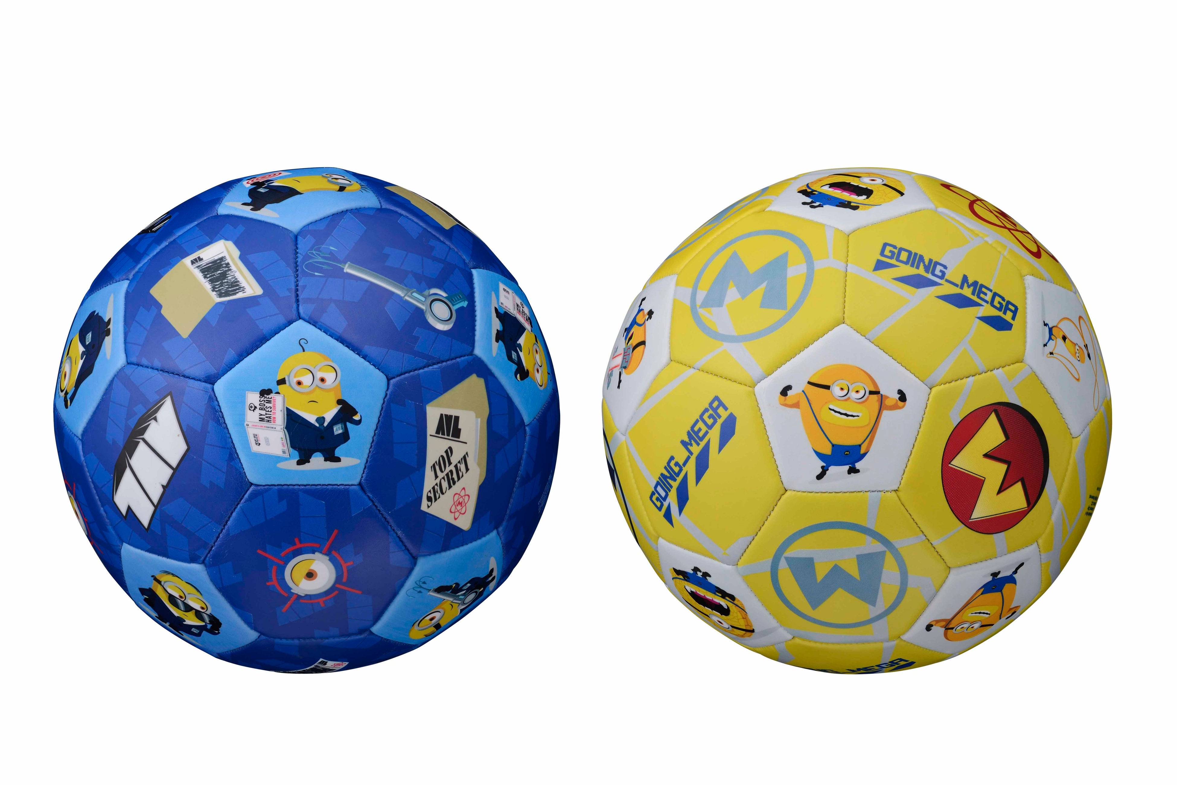 スーツとオーバーオール姿のミニオンがデザインされたサッカーボール。ブルー、イエローの2種類。