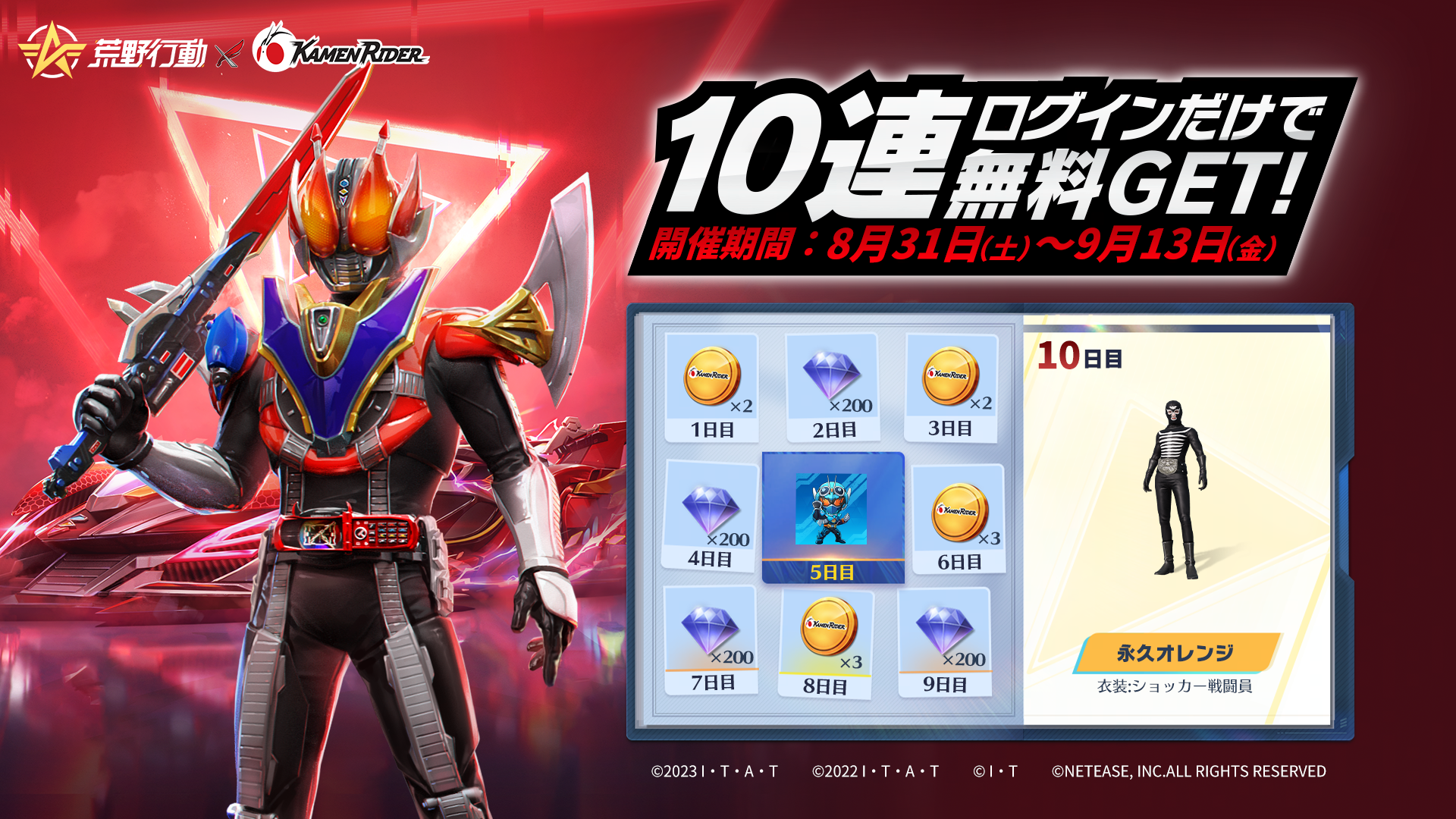 NetEase Gamesが開発・運営する大人気バトルロワイヤルゲーム『荒野行動』にて、2024年8月31日から2024年9月13日の期間中、特撮テレビドラマ『仮面ライダー』シリーズとのコラボイベント第2弾を開催いたします。