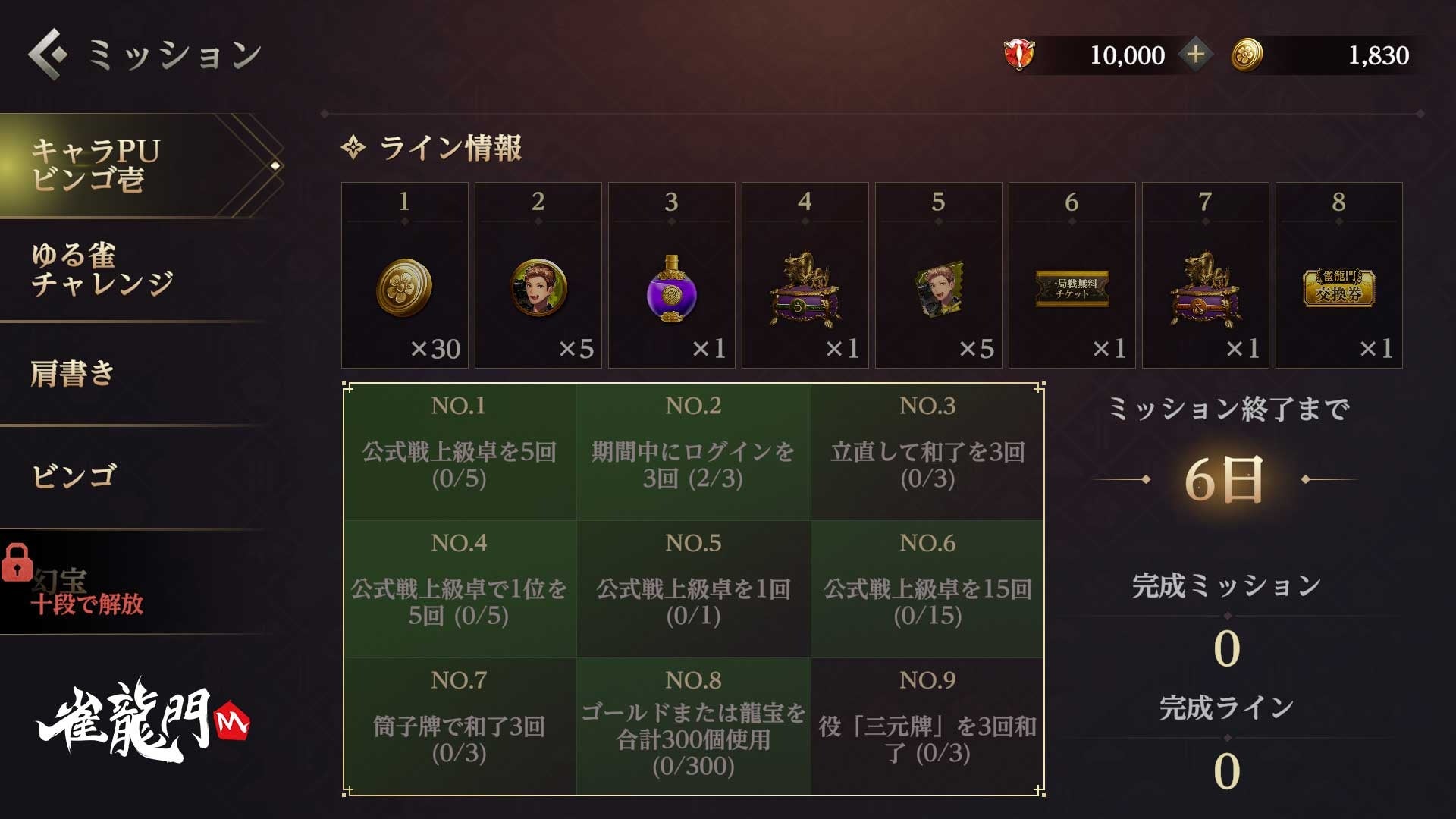 ビンゴミッションは9つのマスにそれぞれミッションが割り振られており、タテ・ヨコ・ナナメに並ぶマスのミッションをクリアすることでラインが完成し、完成したラインの数に応じて報酬を獲得できます。