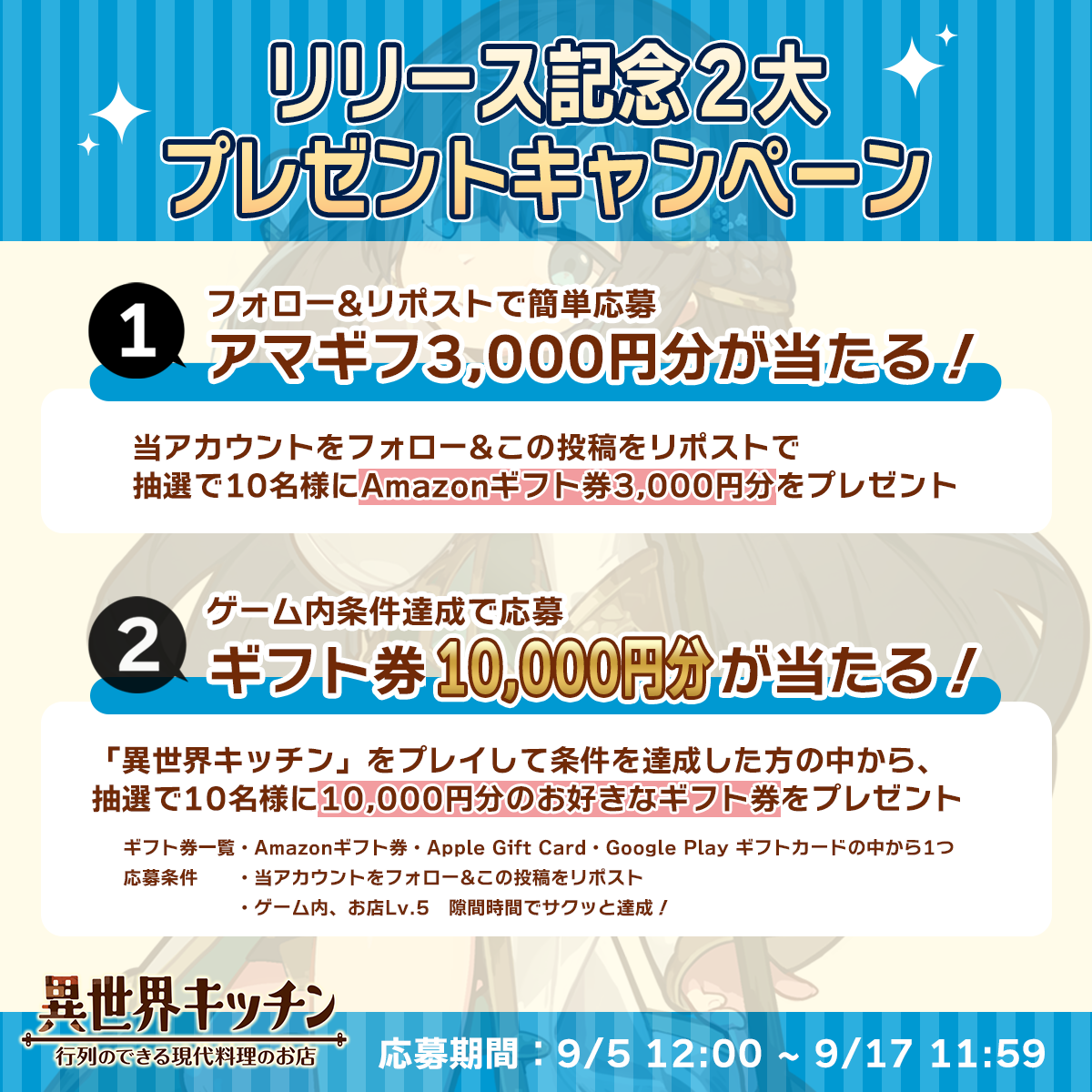 『異世界キッチン 行列のできる現代料理のお店』公式X(旧Twitter)上で本ゲーム公式アカウントをフォローした上で、該当ポストをリポストすると抽選で10名様に3,000円分のAmazonギフト券が当たります。