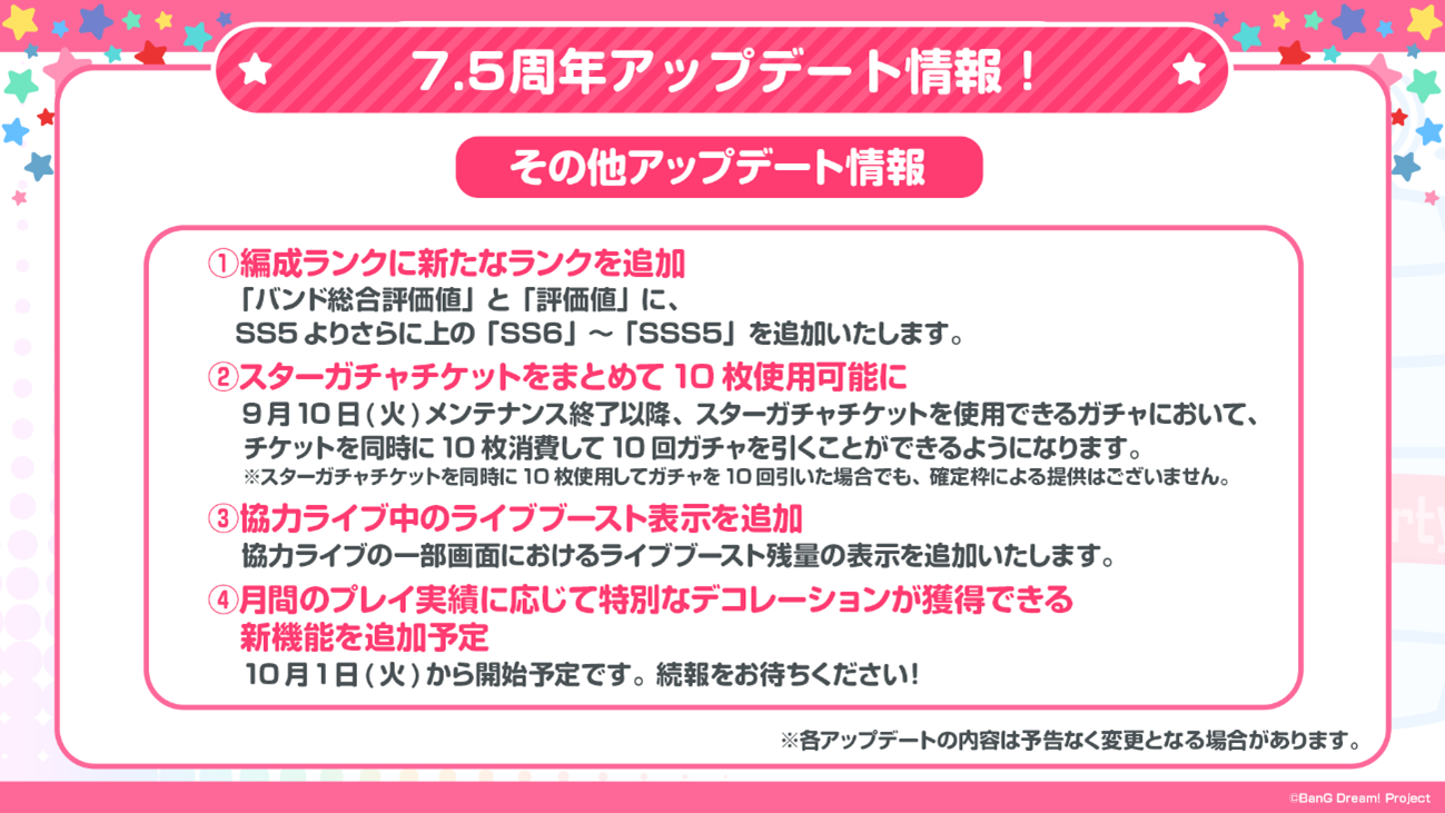 その他にも様々なアップデートを実施予定です。詳細は9月10日(火)のゲーム内お知らせやガルパ公式Xをご確認ください。