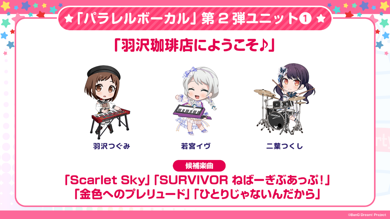パラレルボーカル第1弾ユニット「あこがれの共演」(メンバー:戸山香澄、美竹蘭、ロック、椎名立希)の歌唱楽曲は『迷星叫』に、「I♡インドア」(メンバー:市ヶ谷有咲、白金燐子、倉田ましろ)の歌唱楽曲は『Blessing Chord』に決定いたしました。