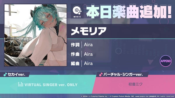 株式会社セガ(本社:東京都品川区、代表取締役 社長執行役員COO:内海州史)と株式会社Colorful Palette(本社:東京都渋谷区、代表取締役社長:近藤裕一郎)は、iOS/Android向けリズム&アドベンチャー『プロジェクトセカイ カラフルステージ! feat. 初音ミク(以下、プロジェクトセカイ)』について、2024年10月21日(月)より、新たに「メモリア」(作詞・作曲:Aira)をリズムゲーム楽曲に追加いたしました。