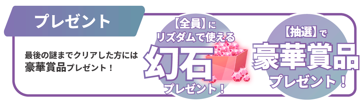 ゴールの謎を解き、クリアした方全員にリズダム内で使えるゲーム内通貨“幻石”、さらに抽選で豪華賞品をプレゼント。