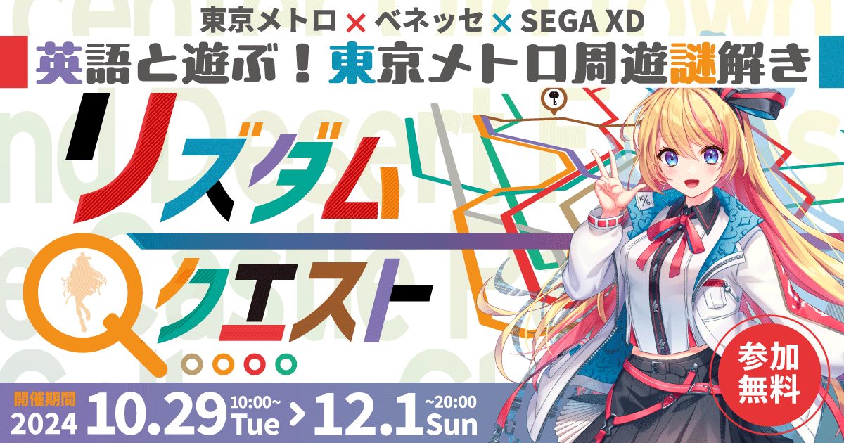 本イベントには、東京メトロ駅構内に掲出されたポスターや駅に設置されたチラシ等から本イベントの二次元コードを読み込み、公式LINEアカウント(リズダムクエスト)と友だち登録することで、どなたでもご参加可能です。LINEトーク画面上で出題される「謎」を解くと、次の行先となる駅(謎解き用の二次元コードをポスターに掲示)を知ることができます。それら経由駅を経て、ゴール(駅)に到達すると、ゲーム型英語学習アプリ「Risdom(リズダム)」(ベネッセ・セガXD共同開発)内で使えるゲーム内通貨“幻石”を全員にプレゼント、さらに抽選で豪華賞品が当たります。