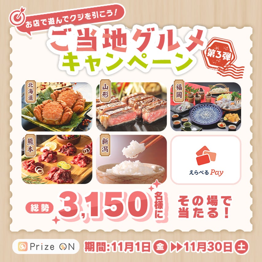 株式会社セガ フェイブは、UFOキャッチャー®をおトクに遊べるアプリ『Prize ON(プライズ オン)』において、2024年11月1日(金)より『その場で当たる!Prize ON限定 ご当地グルメキャンペーン(第3弾)』を実施いたします。