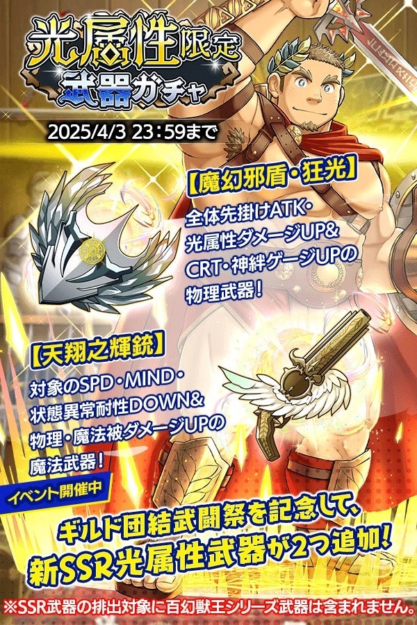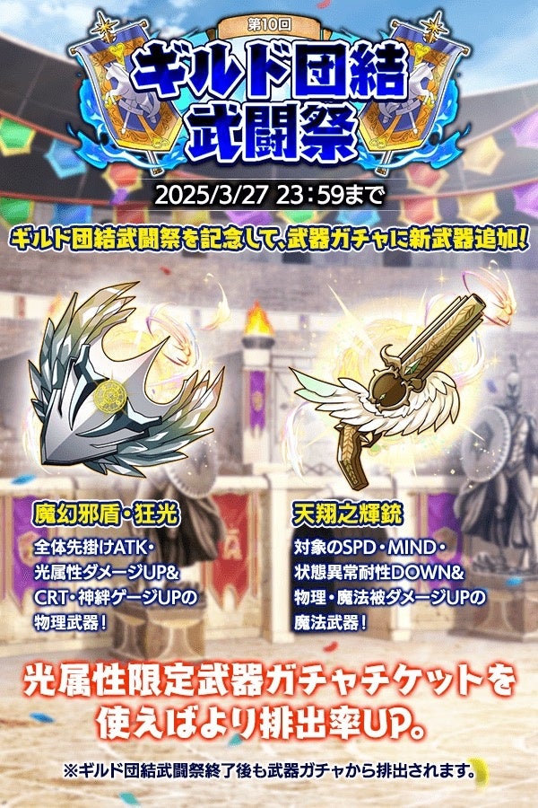 また、武器ガチャに「魔幻邪盾・狂光」「天翔之輝銃」の2種が追加!イベント報酬の光属性限定武器ガチャチケットでも入手可能ですので、ぜひイベントに挑戦してみてください。