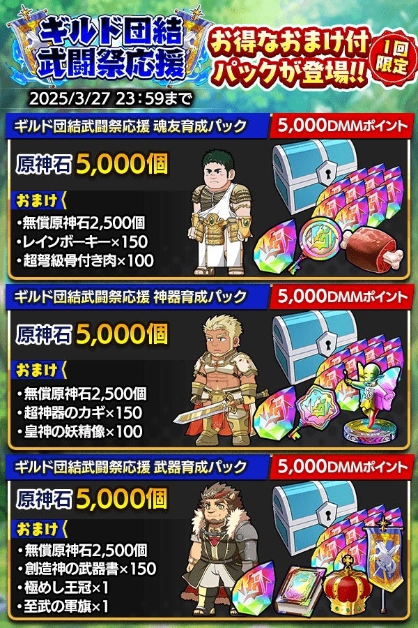 さらに、レインボーキーや超神器のカギ、極めし王冠といった育成アイテムがセットになった「ギルド団結武闘祭応援育成パック」も3種登場!おトクに原神石を購入できるチャンスですのでお見逃しなく。