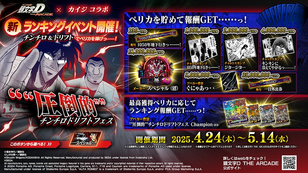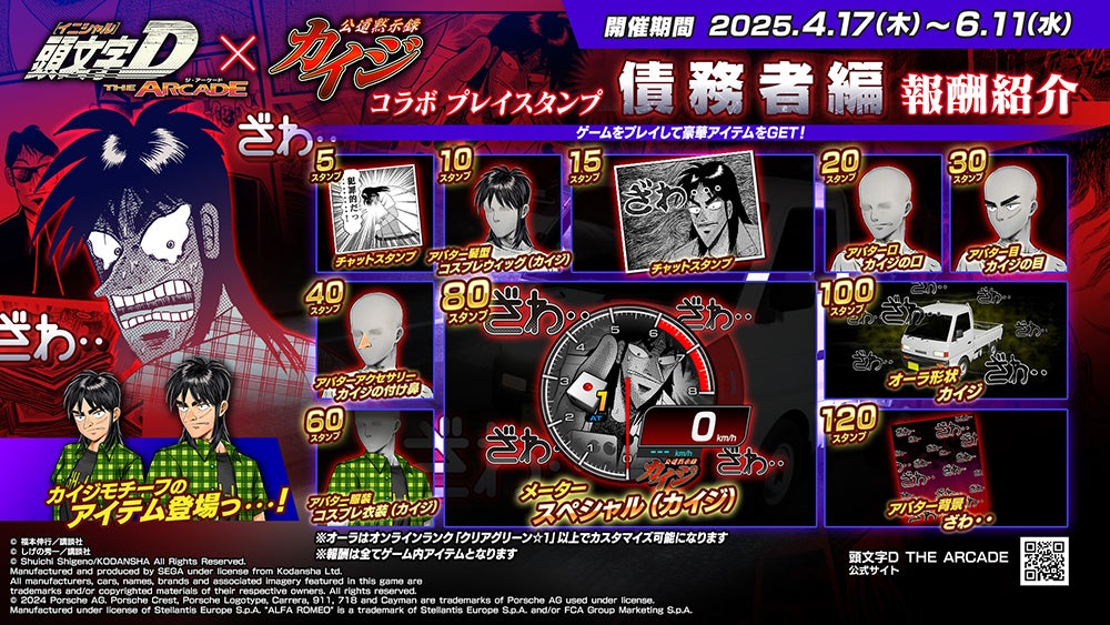株式会社セガ フェイブ(本社:東京都品川区、代表取締役社長執行役員:杉野行雄、以下 セガ フェイブ)は、アミューズメント施設向けタイトル『頭文字D THE ARCADE(以下、頭文字DAC)』におきまして、2025年4月17日(木)より『カイジ』とのコラボレーションイベントを開催いたします。