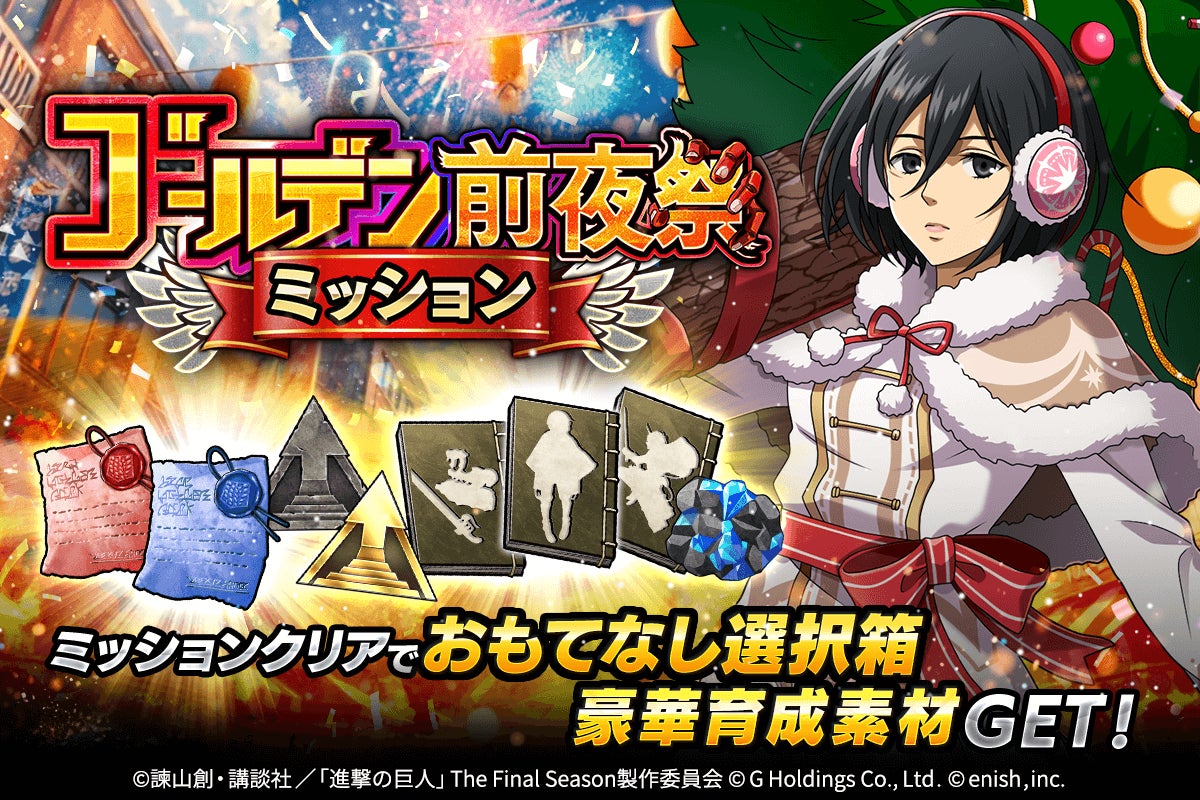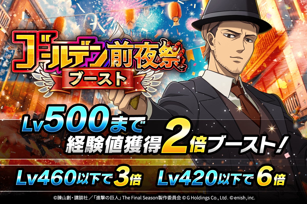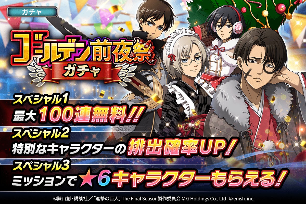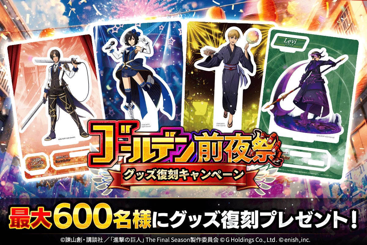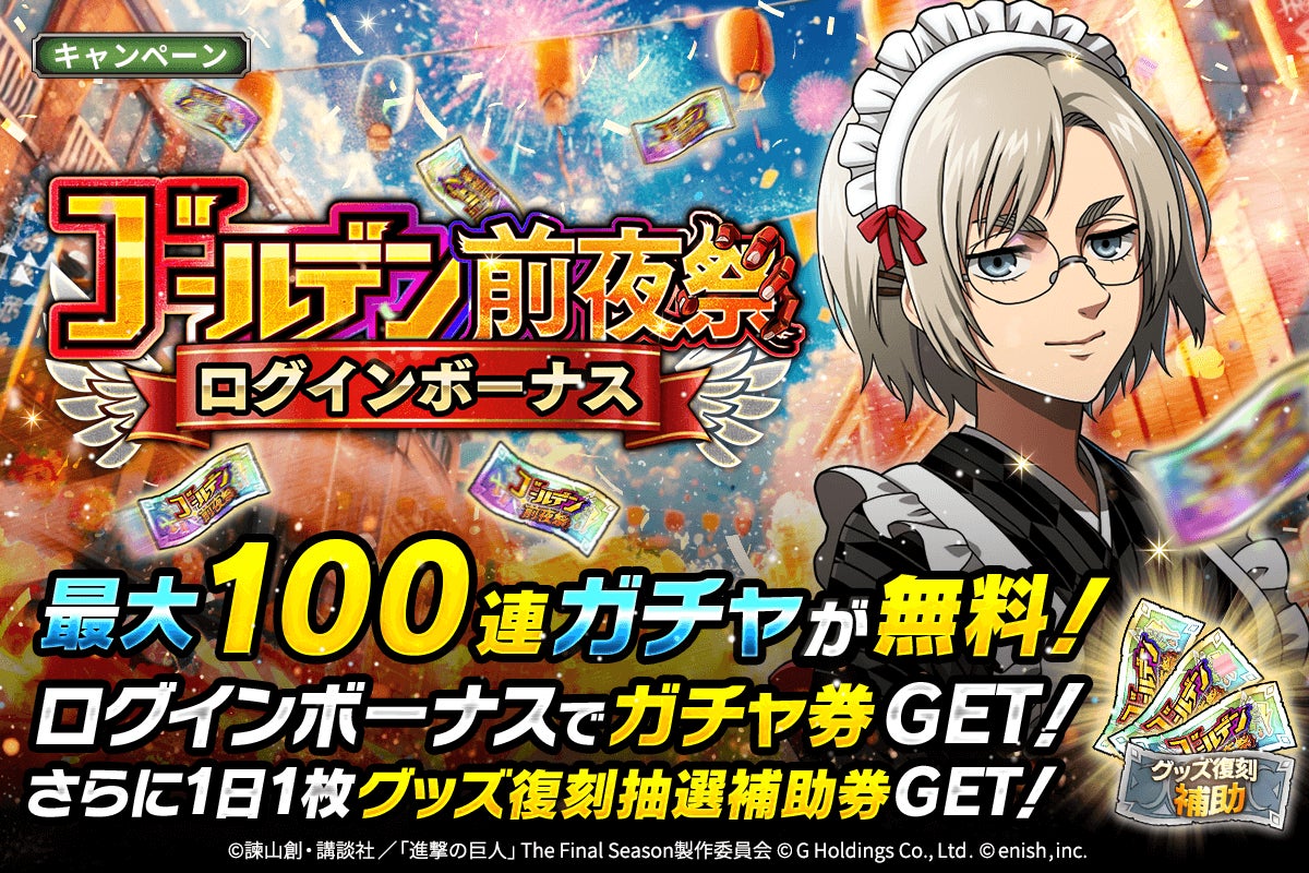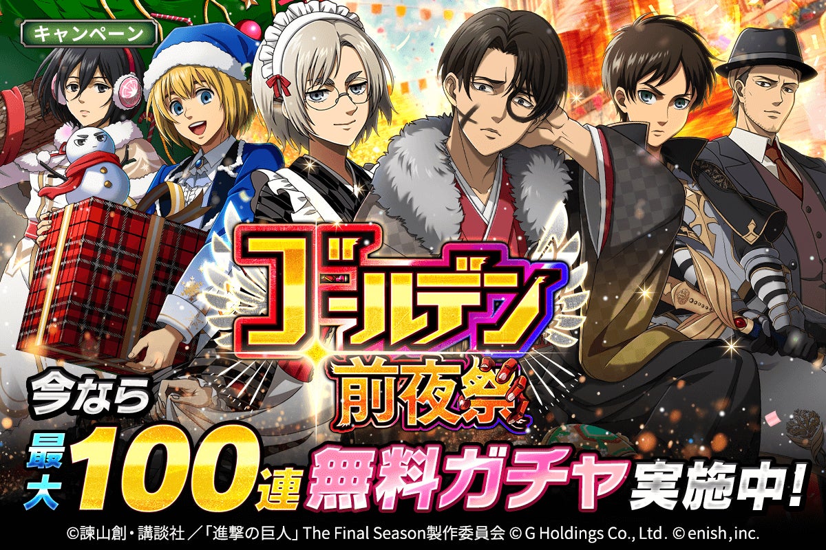 株式会社enish(本社:東京都港区、代表取締役社長:安徳 孝平、以下enish)は、アニメ『進撃の巨人』のスマートフォンゲーム最新作「進撃の巨人Brave Order」にて、2025年4月18日(金)より、ゴールデン前夜祭を開催!本キャンペーンではログインで特別なガチャが無料で最大100連可能なキャンペーン等、お得なキャンペーンを多数開催!その他、最新情報はゲーム公式サイト・ゲーム公式X(旧Twitter)アカウントにて随時公開して行きますので、ぜひご覧ください。