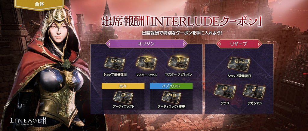 リザーブ ワールドでは、1回目の出席で「INTERLUDEクーポン:ショップ装備復旧」を、7回目で「INTERLUDEクーポン:クラス」を、14回目で「INTERLUDEクーポン:アガシオン」を獲得することができます。