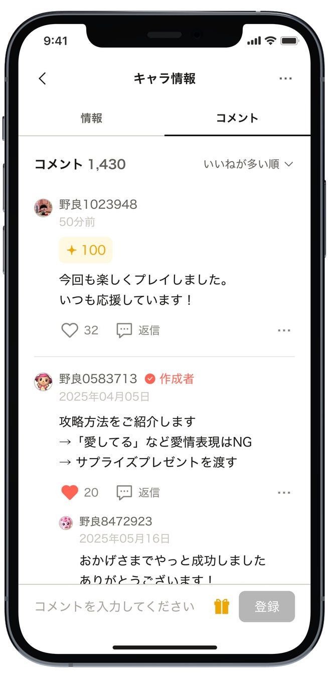 自分のオリジナルキャラを共有し、他のキャラクターに「いいね」やコメントを送ることで応援できます。