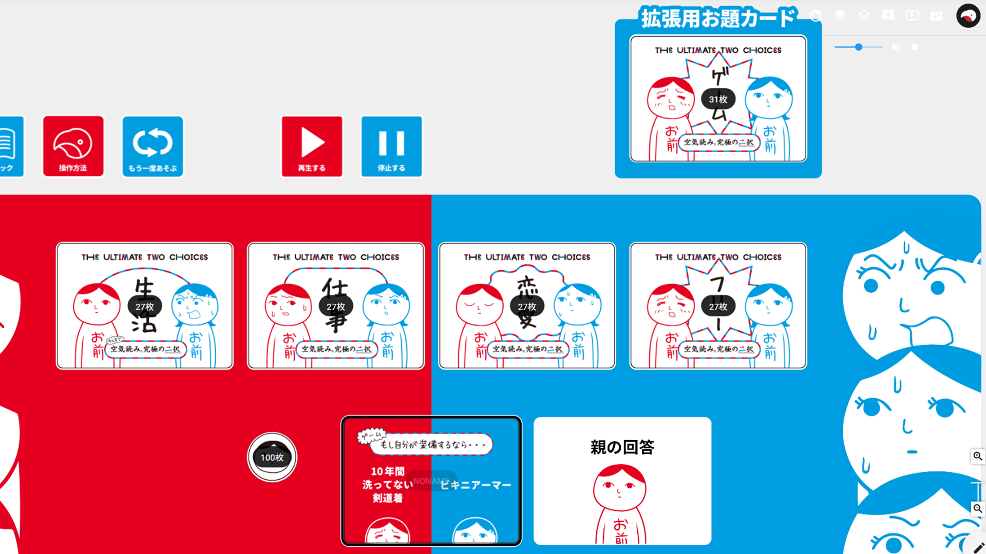 そして、ボードゲーム「みんなで空気読み。究極の二択」のオンライン版が発売開始となりました。ボードゲームにも対応したTRPGオンラインセッションツール「ココフォリア」にて購入いただけます。