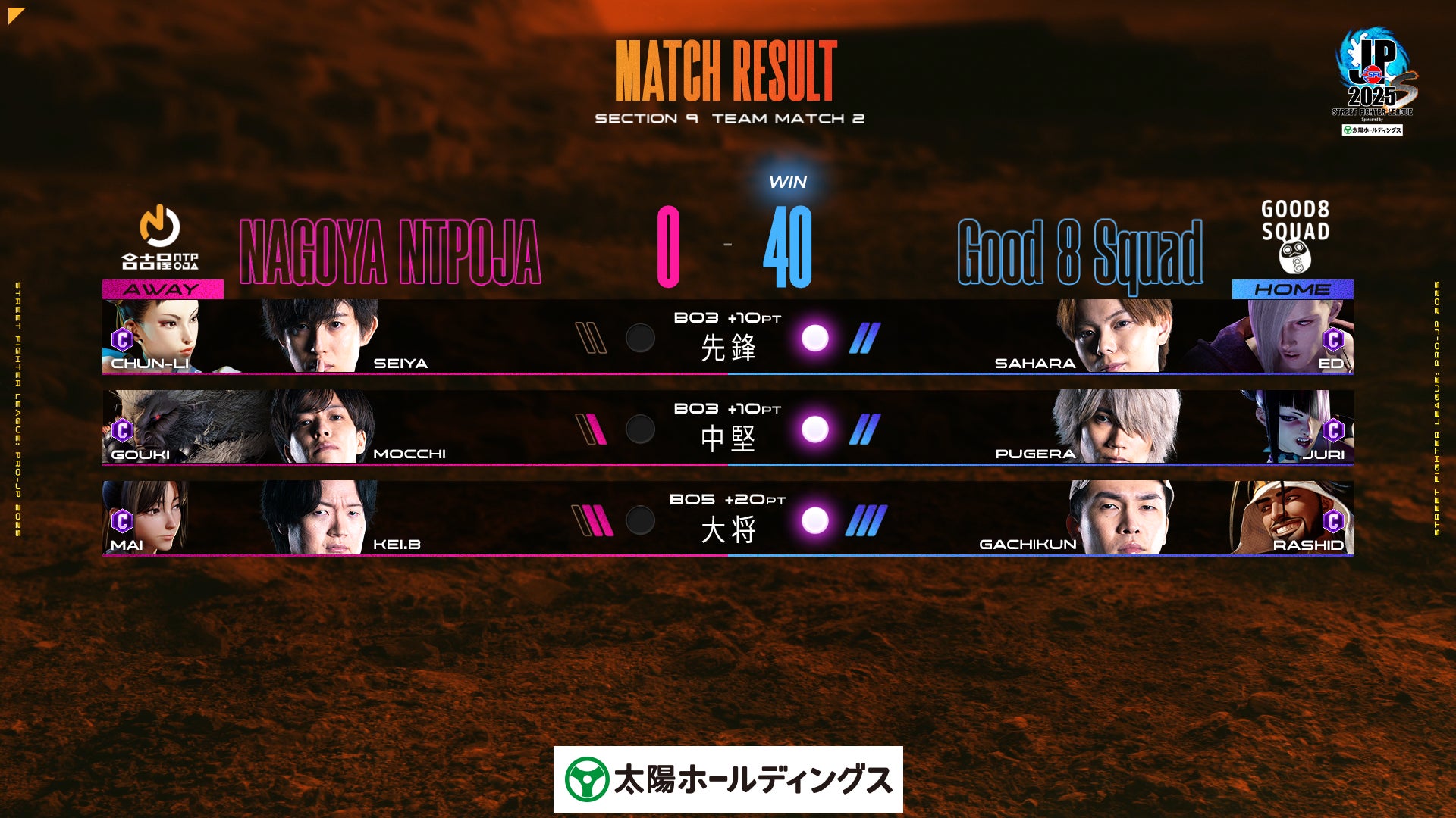 先鋒の「Seiya選手」に対し、「Good 8 Squad」はポイントゲッターの「さはら選手」を送り込む。互いに慎重な中距離戦を展開するも、わずかな隙から「さはら選手」が大ダメージを取りつづけ、チームにポイントを持ち帰る。続く「ぷげら選手」も「もっちー選手」の「豪鬼」に対し、ジュリを繰り出して見事勝利。勢いづく「Good 8 Squad」の前に今シーズン8勝無敗の「KEI.B選手」が立ちはだかるも、「ガチくん」が9連勝目に待ったをかける。互いに一歩も譲らない攻防の中、開幕からの強気な攻め、スーパーアーツLv.2「イウサール」を利用した展開など、引き出しの多さを見せつけ、フルセットの末「ガチくん選手」がチームに勝利をもたらした。
