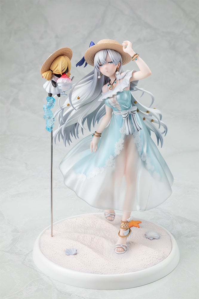 「アーチャー/アナスタシア&ヴィイ 1/7スケールフィギュア」は、2021年に開催された夏イベント「カルデア・サマーアドベンチャー!」で初登場した、夏を満喫するために水着に着替えた皇女様の美しい姿をイラストのイメージそのままに再現。ワンピースにはクリアパーツを使用し、フィギュアの軽やかさを演出。ワンピース越しに見える整ったプロポーションはもちろん、初登場時のクールな雰囲気とはまた違った、可愛らしい笑顔も魅力的に再現しています。また、麦わら帽子やヴィイが手にするかき氷、砂浜をイメージした台座なども丁寧に再現しており、夏らしい雰囲気を表現しています。