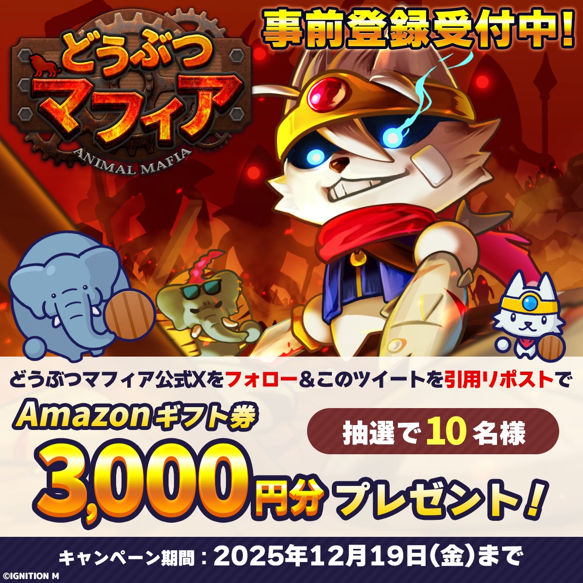 株式会社イグニッション・エム(大阪府大阪市北区、代表取締役 升田貴文)は、2025年12月5日(金)、最新作「どうぶつマフィア」の事前登録が10万人の突破、および豪華Xキャンペーンの開始をお知らせいたします。