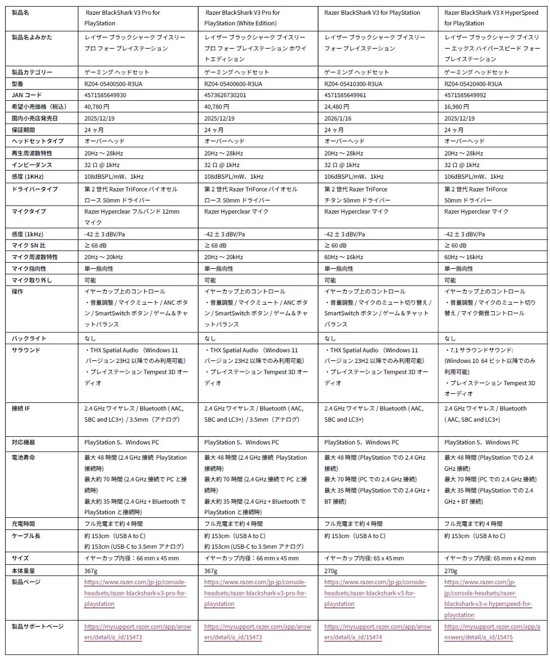 ゲーマー向けライフスタイルブランドとして世界をリードするRazer™(本社:米国カリフォルニア州およびシンガポール)の日本法人Razer Japan株式会社は、PlayStation®5向けワイヤレスゲーミングヘッドセット3機種4製品「BlackShark V3 X HyperSpeed for PlayStation」、「BlackShark V3 for PlayStation」、およびアクティブノイズキャンセリング(ANC)搭載のフラッグシップモデル「BlackShark V3 Pro for PlayStation / BlackShark V3 Pro for PlayStation(White Edition)」を日本国内で発売します。「BlackShark V3 X HyperSpeed for PlayStation」と「BlackShark V3 Pro for PlayStation」は2025年12月19日より、「BlackShark V3 for PlayStation」は2026年1月16日より発売予定です。全国の家電量販店、PCショップ、オンラインショッピングサイトなどで購入いただけます。購入予約は既に受付を開始しています。