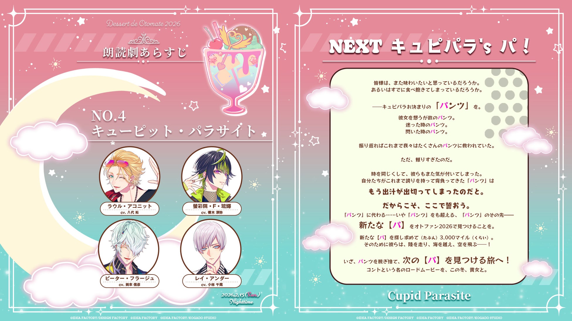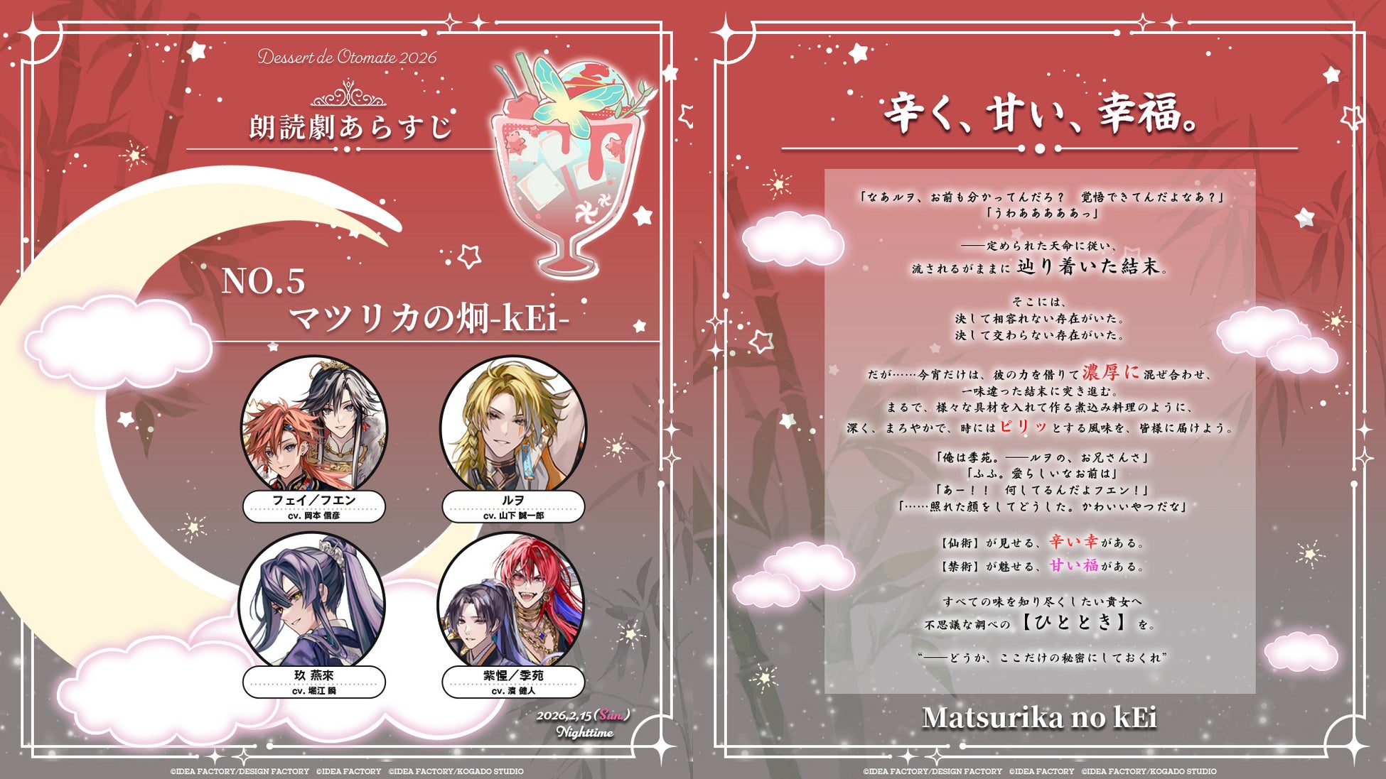 アイディアファクトリー株式会社(代表取締役社長:佐藤 嘉晃/所在地:東京都豊島区)の女性向けゲームブランド「オトメイト」は、2026年2月15日(日)開催予定のオトメイトファンイベント「Dessert de Otomate 2026」内のコーナーのひとつ「ファン参加企画」の回答受付を本日より開始いたしました。