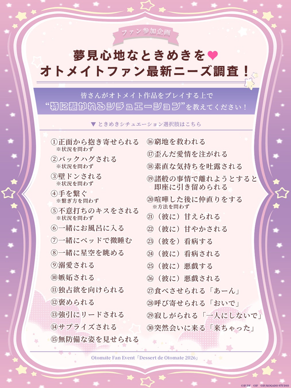 皆様には事前アンケートとしてスタッフ厳選のときめきシチュエーションを30個用意しておりますので、オトメイト作品をプレイする上でご自身が“特に惹かれるシチュエーション”を【3つ】選択してください♪